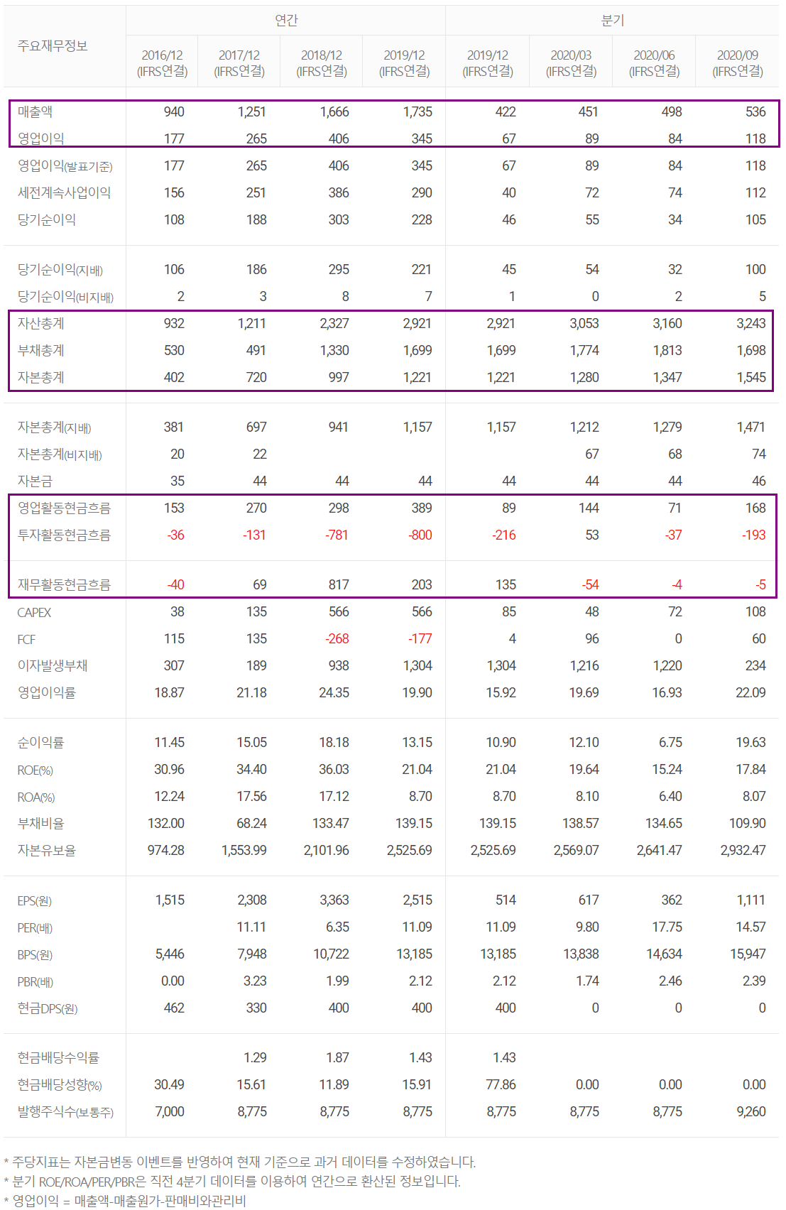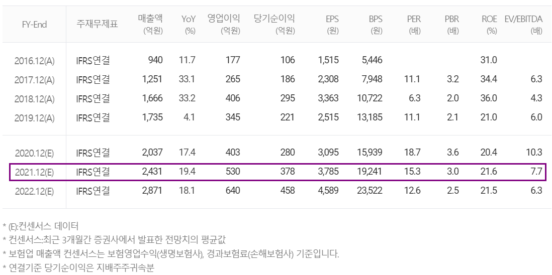 조만간 실적이 공시되겠지만 지난 3분기까지의 추이를 볼 때 2020년에도 상당한 실적 성장이 예상되며, 2021년 컨센서스 기준 매출액은 2,431억 원으로 전년 대비 19.4%, 영업이익은 530억 원을 기록할 것으로 전망했습니다.