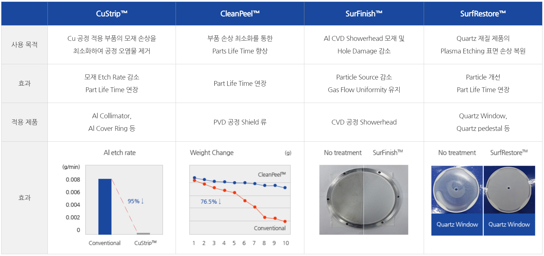 당사는 고객사의 다양한 공정 및 사용되는 부품에 따라 적합한 세정 및 재생 솔루션을 제공하고 있으며, 주로 식각, 증착 공정 장비 부품에 적용됩니다. 주요 세정 기술에는 CuStrip, CleanPeel, SurfFinish, SurfRestore 등이 있습니다.