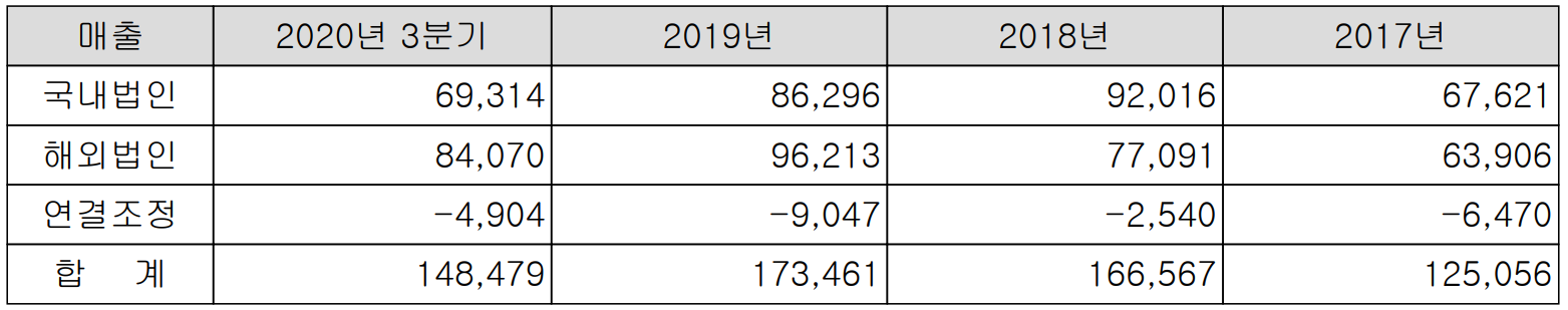 당사의 세정 및 코팅 솔루션을 통한 매출은 2020년 3분기 기준 국내 법인이 693억 원으로 46.7%를 차지하며, 해외법인의 매출은 840억 원입니다.