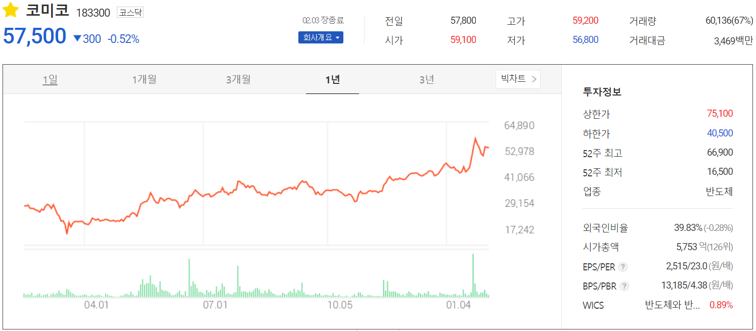 최근 잇따른 전방업체 들의 설비 투자 소식에 급등하다가 주춤하는 모양새입니다. 2월 3일 종가 기준으로 외국인 비율은 39.83%로 높은 편이고, 시가총액 5,753억 원으로 코스닥 상위 126위 종목입니다.