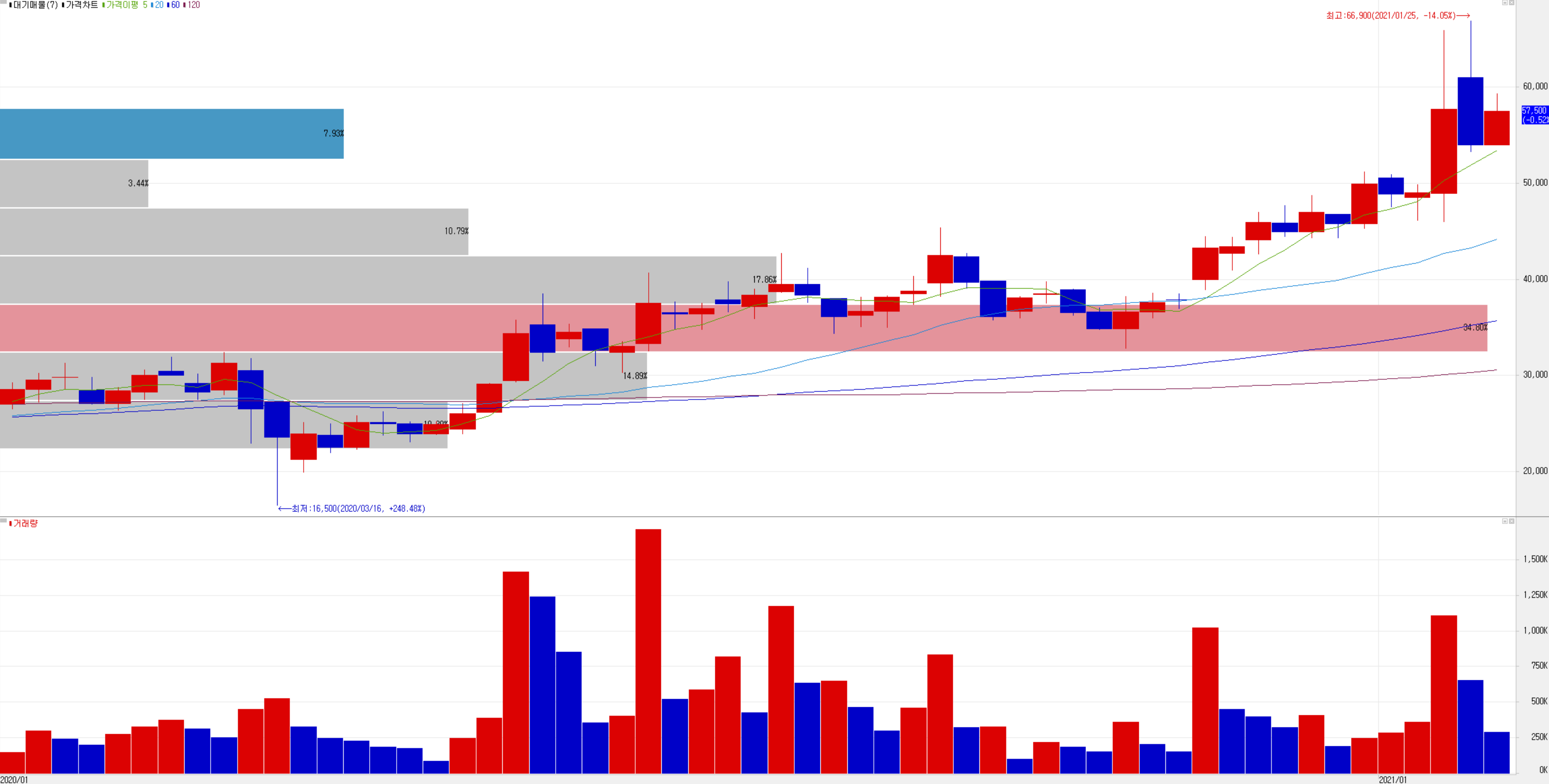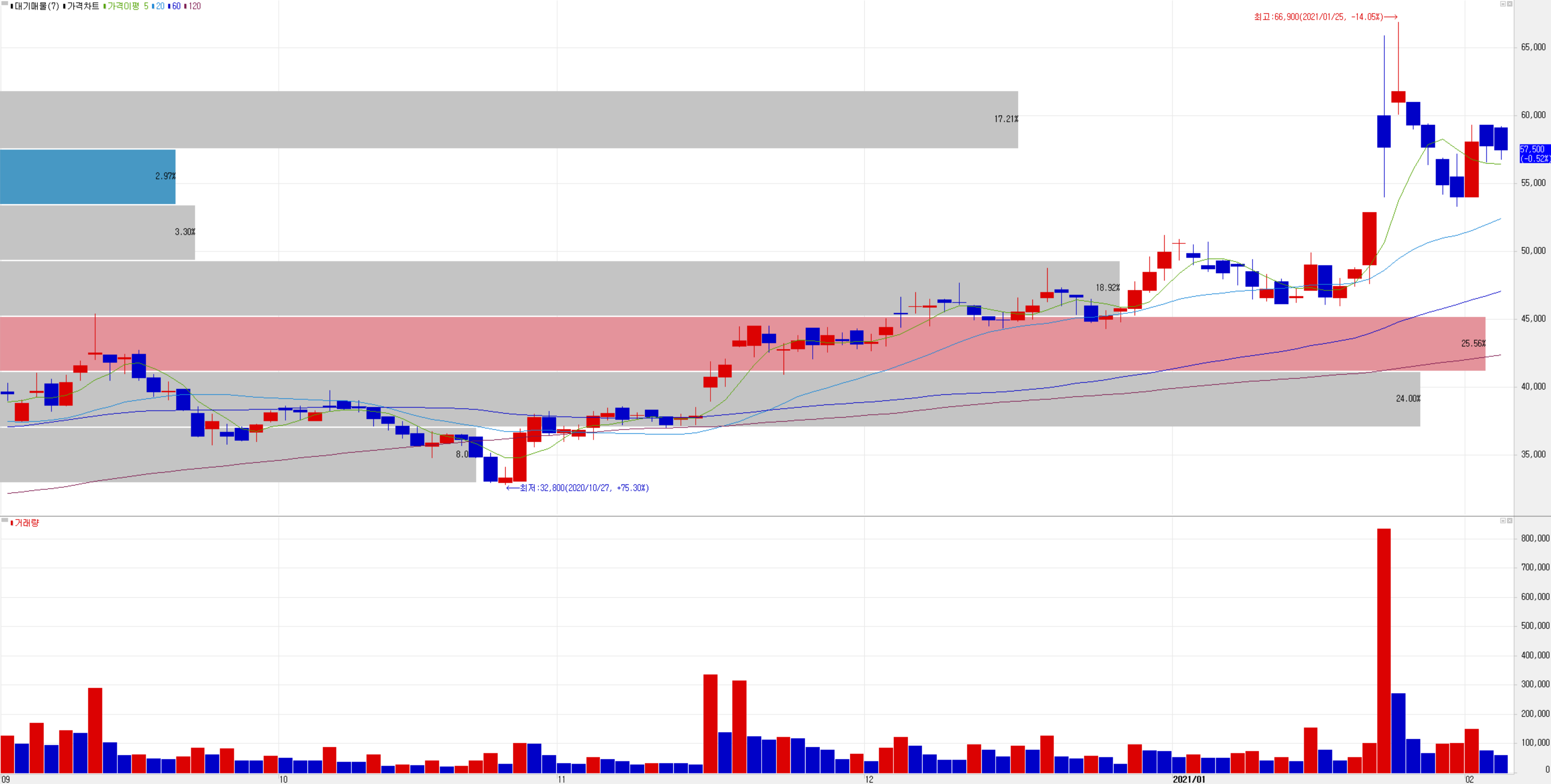 최근 수급에서는 외국인과 기관의 매물을 개인이 대부분 받아내는 형국입니다. 지난 1월 25일 신고가를 기록한 이후 2월 3일 기준 5일선을 잘 지지하는 모습이지만 차익실현에 따른 단기 하락 추세가 보이므로 신중하게 접근하는 게 좋겠습니다. 54,000원을 지지하는지 보면서, 향후 사업에 대한 전망이 좋은 기업으로 4분기 실적 발표 후 차트를 다시 봐도 늦지 않을 것 같습니다.