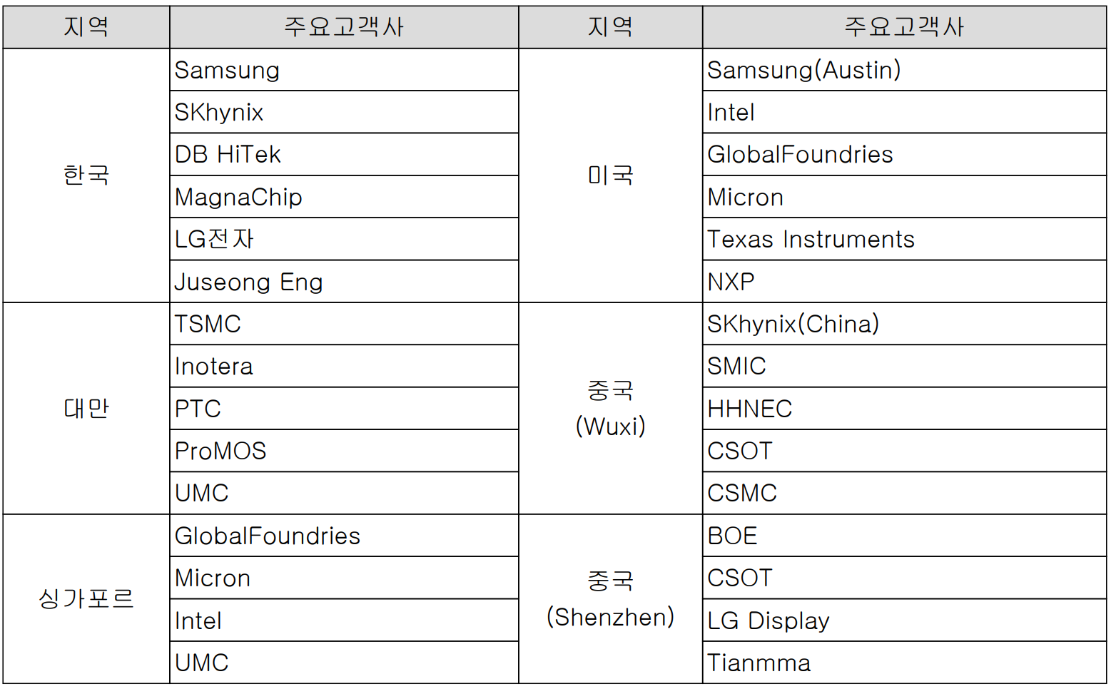 당사는 국내 글로벌 반도체 기업인 삼성전자, SK하이닉스, DB하이텍, 매그나칩, LG전자, 주성엔지니어링 등을 고객사로 확보하고 있으며, 해외 기업으로는 대만의 TSMC, 싱가포르 Micron, 중국의 CSOT, BOE, Tianma 등 세계 유수의 반도체 및 디스플레이 업체들과 거래를 하고 있습니다.