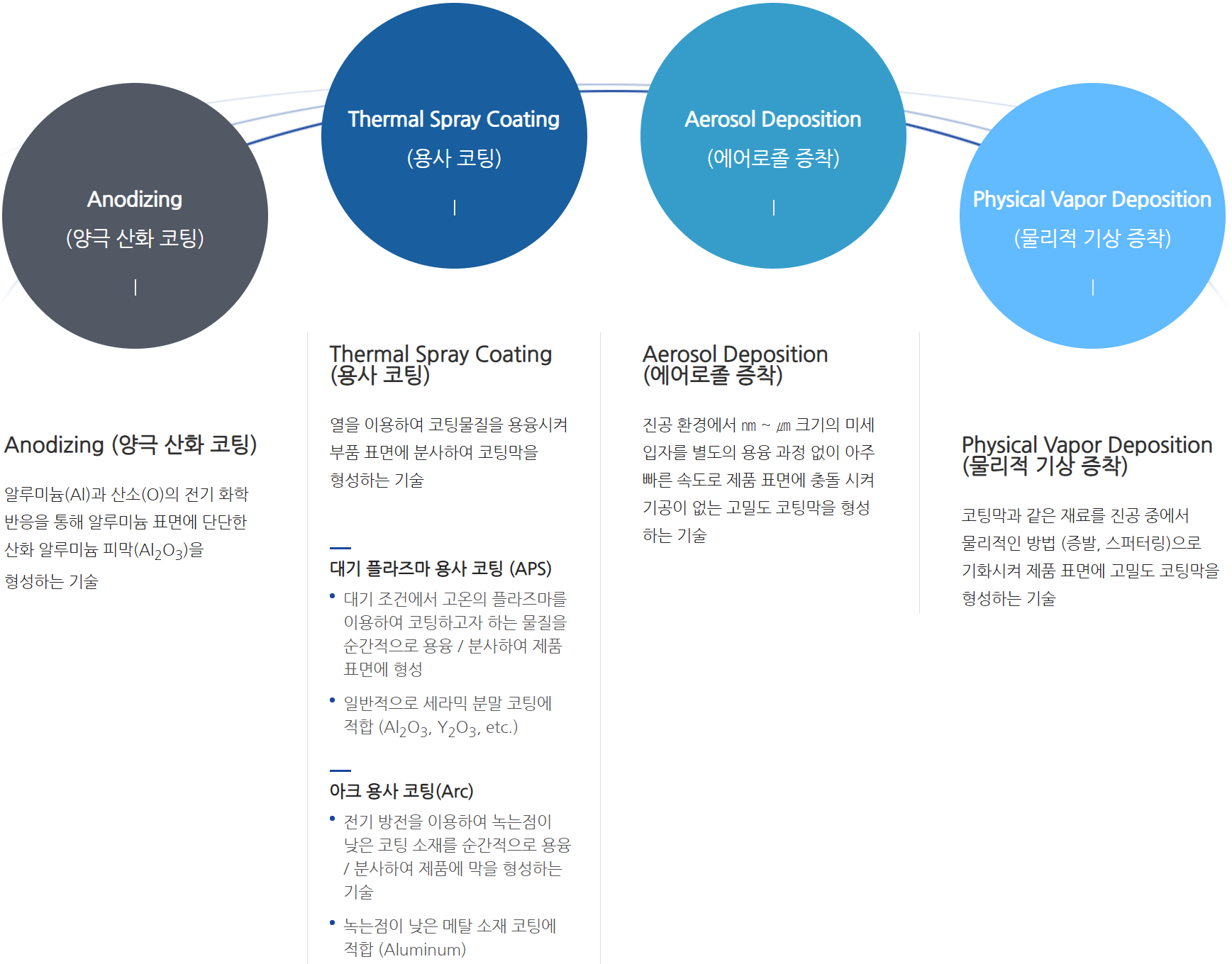 코팅 기술에는 크게 Anodizing(양극 산화 코팅), Thermal Spray Coating(용사 코팅), Aerosol Deposition(에어로졸 증착), Physical Vapor Deposition(물리적 기상 증착) 등이 있습니다. 이러한 기술은 그 공법과 물리적 특성에 따라 세라믹 코팅, 메탈 코팅, 아노다이징 등으로 구분됩니다.
