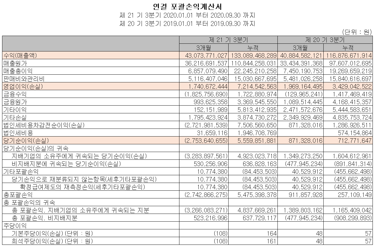 당사의 2020년 3분기 누적 기준 매출액은 1331억 원으로 전년 동기 대비 13.9% 증가했고 영업이익은 72억 원으로 110% 증가했습니다. 파생상품에 대한 평가이익, 투자부동산 처분 이익 및 외환 관련 이익 등으로 영업이익의 규모가 크게 늘었습니다. 다만 당 분기 중 공사 미수금 27억 여원에 대한 손실 충당을 결정함으로써 당기순손실을 기록했습니다.