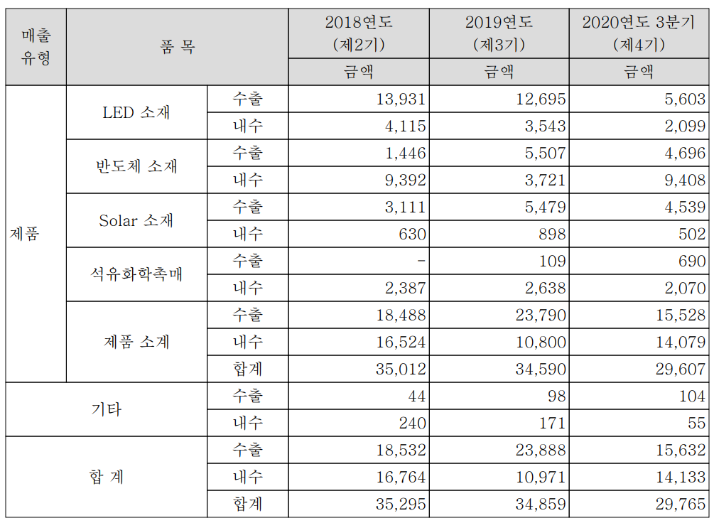 2020년 3분기 기준 전체 매출의 제품별 매출 비중은 LED 소재 25.9%, 반도체 소재 47.4%, Solar 소재 16.9%, 석유화학촉매 9.3%를 차지하고 있습니다. 반도체 소재 부문의 매출 증가세가 눈에 띄며 석유화학 촉매의 수출이 2019년도부터 인식되기 시작했습니다.