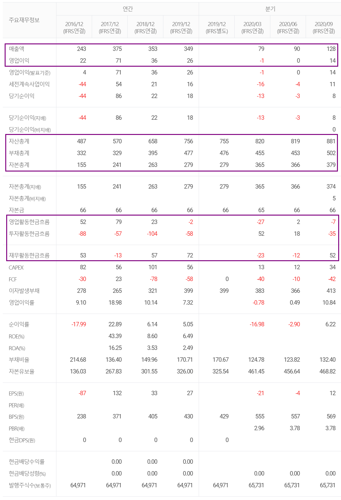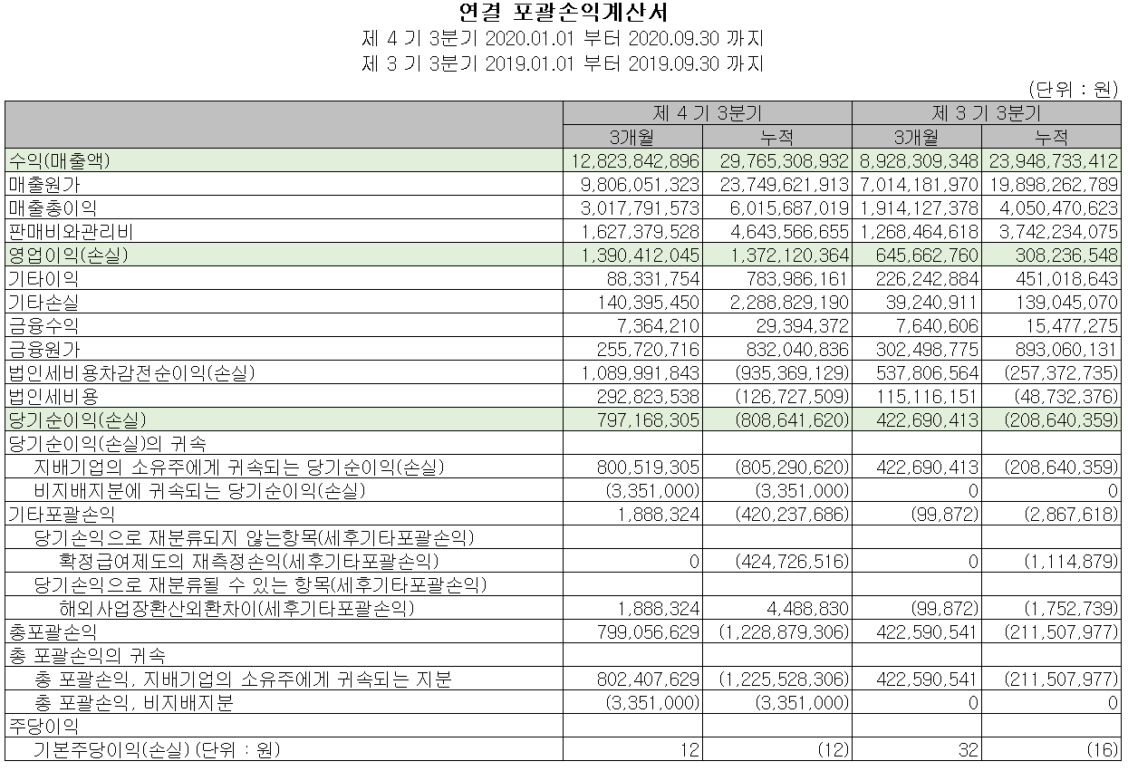 당사의 2020년 3분기 누적 기준 매출액은 297.6억 원으로 전년 동기 대비 24.3% 증가했고, 영업이익은 13.7억 원으로 345.5% 증가했습니다. 연간 매출액은 전년 대비 증가할 것으로 예상되지만, 코로나19 영향으로 LED 조명 부문의 매출 감소로 인한 고정비 부담으로 1분기 적자를 기록하면서 누적 기준 영업 적자를 기록하고 있으나 3분기 당기만으로는 상당 부분 개선되는 모습입니다.