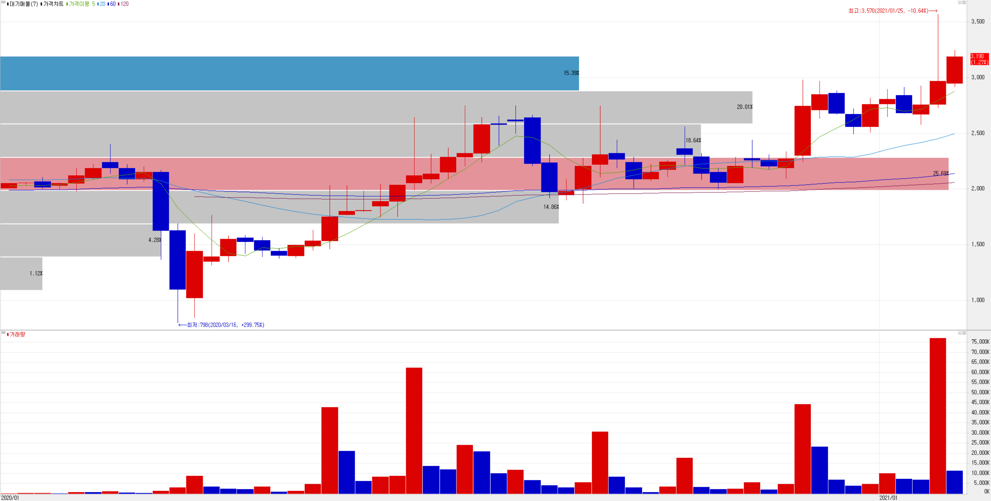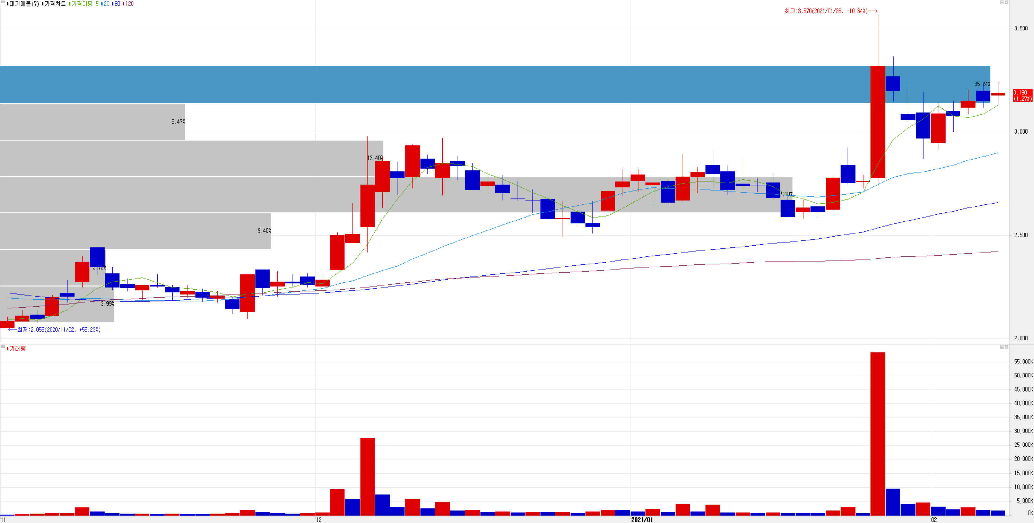 지난 3 거래일 동안 5일 이동평균선 위로 조금씩 이동하는 모습을 보이고 있습니다. 지난 12월 초순부터 횡보하던 주가는 삼성전자와 인텔의 위탁생산 소식이 전해진 1월 말부터 주가가 움직이다가 일부 되돌리면서 단기 횡보 중입니다. 기술적으로는 좋은 자리에 있다고 판단되며 개인적으로 손절가 2,700원 설정하고 조정 시 진입할 생각입니다.