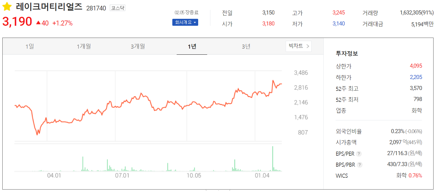 지난 2월 5일 종가는 3,190원에 거래되었습니다. 외국인 비중은 0.23%이고, 시가총액 2,097억 원으로 코스닥 상위 445위 종목입니다.