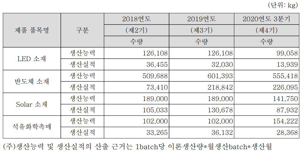 2020년 3분기까지 LED는 14%, 반도체 40.7%, Solar 62.7%, 석유화학 촉매 15.2%의 가동률을 보이고 있습니다.