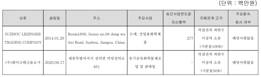 당사는 2개의 종속회사가 있는데, 당사 주요 제품에 대한 판매, 공급을 목적으로 하는 중국 Suzhou 현지 법인과 유기금속화학물 제조 및 판매를 영위하는 (주)레이크테크놀로지가 있습니다.