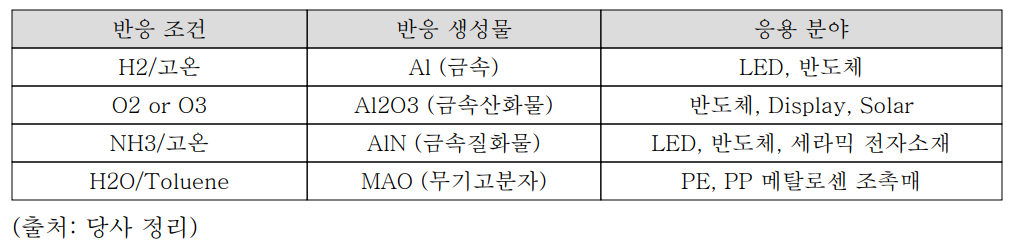 유기 금속 화합물은 다양한 분야에서 응용되고 있는데 이유는 유기금속 화합물이 반응 조건에 따라 금속, 금속산화물, 금속질화물, 무기물 등으로 다양한 생성물을 생성하기 때문입니다. 당사는 특히 다양한 유기 금속 화합물 중 여러 응용 분야와 반응성을 고려해 볼 때 가장 대표적인 유기금속 화합물이 TMA라고 판단하여 이를 기반으로 하여 반도체, LED, 디스플레이 및 정밀화학 촉매 분야 사업까지 넓게 진출하게 되었습니다.