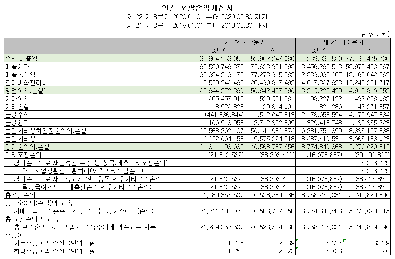 당사의 2020년 3분기 누적 기준 매출액은 2529억 원으로 전년 동기 대비 227.9% 증가했고, 영업이익은 508억 원으로 934% 증가했습니다. 주요 고객사인 삼성디스플레이의 신규 설비 투장에 따른 공급 확대가 주요인으로 파악됩니다.