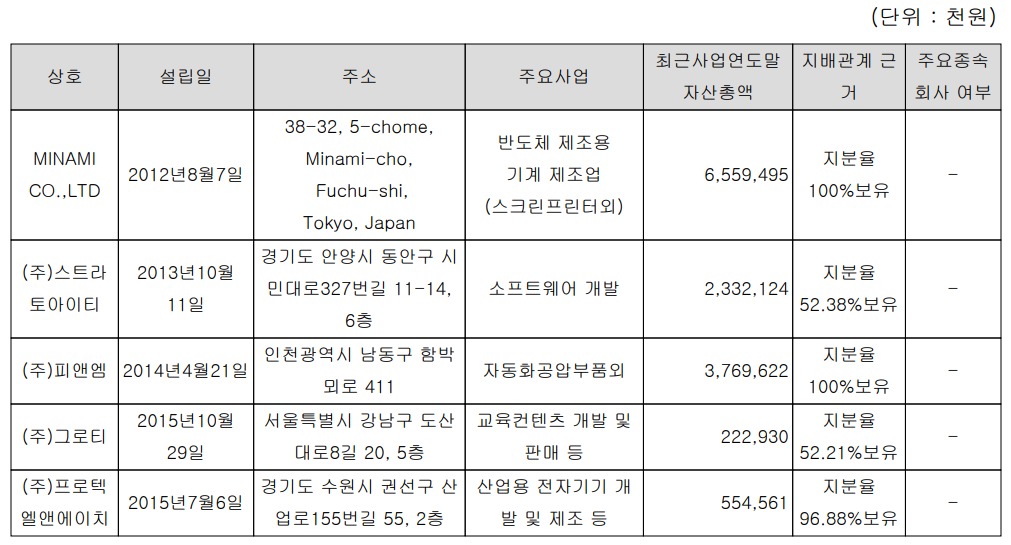 당사는 5개 종속 기업이 있으며, SMT 공정의 솔더 페이스트 인쇄 및 도포 장비 제조업체인 일본의 MINAMI 사를 2012년 인수하였고, 자동화 공압 부품을 제조하는 피앤엠, 산업용 전자기기를 개발하는 프로텍엘앤에이치 등이 있습니다.