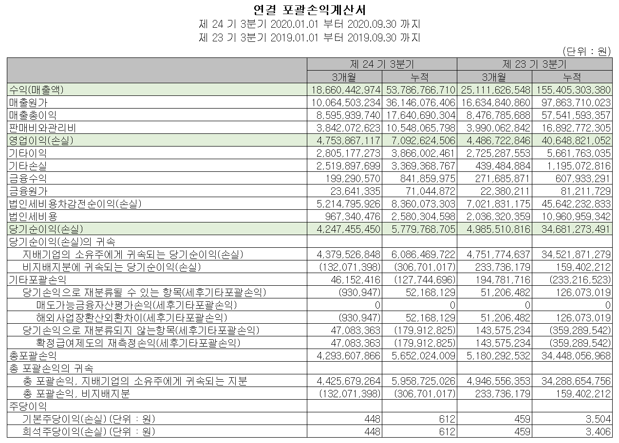 당사의 2020년 3분기 누적 기준 매출액은 538억 원으로 전년 동기 대비 65.4% 감소했고, 영업이익은 71억 원을 기록하면서 82.5% 감소했습니다. 코로나19 영향으로 인한 매출 부진이 주요 원인으로 파악됩니다.