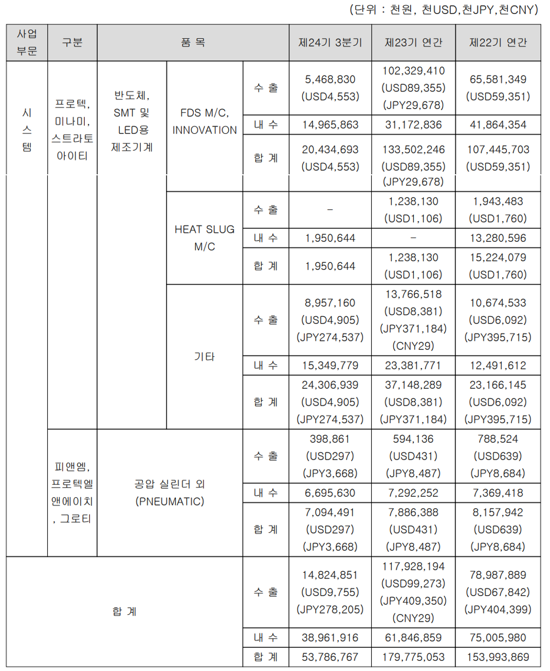당사의 사업부문은 크게 시스템 사업부와 뉴메틱 사업부로 구분되어 있는데, 시스템 사업부는 반도체 패키징과 SMT, LED 패키징, 스마트폰 카메라 모듈 등의 공정에 필요한 디스펜서를 주력으로 다이 본더(Die Bonder), 볼 어태치 시스템(Ball Attach) 등을 제조 공급하고 있습니다. 종속기업인 피앤엠이 주력으로 하는 뉴메틱 사업부에서는 공압 구동형 실린더 등을 제조 공급하고 있습니다.