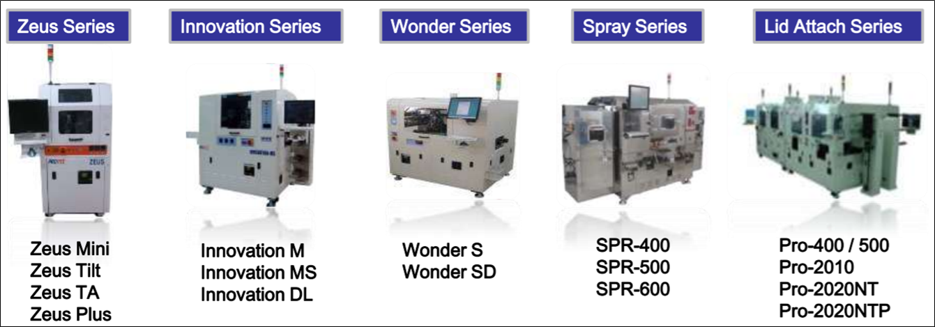 이러한 초미세화 및 고집적화에 대응하기 위해 디스펜싱 물질을 정밀하게 제어할 수 있는 ZEUS 시리즈를 출시하였고, 2017년에는 전자파 차폐(EMI)용 스프레이(Spray) 타입의 디스펜서도 시장에 선보였습니다.