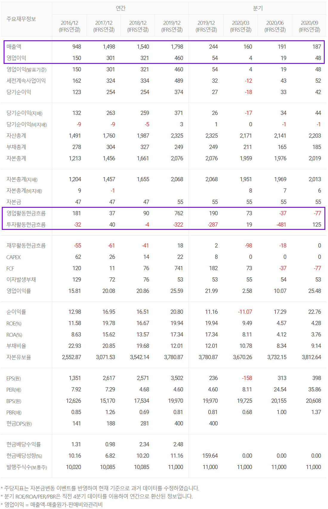 코로나19로 인한 실적 부진으로 현금 흐름 상태도 좋지가 않습니다만, 2019년 큰 폭의 영업이익과 53억 원의 단기 차입금 등으로 보전하면서 실적 악화를 극복하기 위해 연구개발비에 투자하고 있습니다. 또한 3분기 중 반도체 검사장비 제조업체인 마이크로프랜드의 지분 약 17%를 확보하면서, 후공정 장비 분야에 대한 확대 가능성이 예상됩니다.