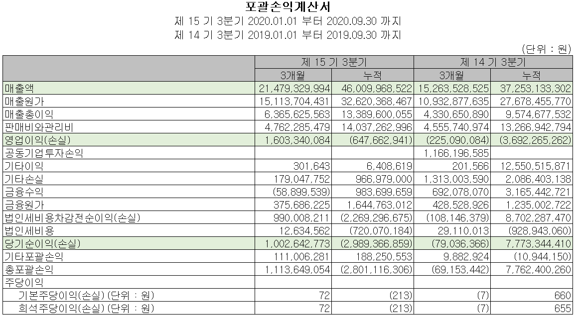 당사의 2020년 3분기 누적 기준 매출액은 460억 원으로 전년 동기 대비 23.5% 증가했고, 영업손실은 82.4% 감소했고, 당기순이익은 적자 전환했습니다. 유동부채가 증가했으나 3분기부터 스마트폰 증가에 따른 OIS Driver IC 등의 수요가 증가하면서 당분기 흑자 전환하는 등 향후 양호한 실적이 기대됩니다.