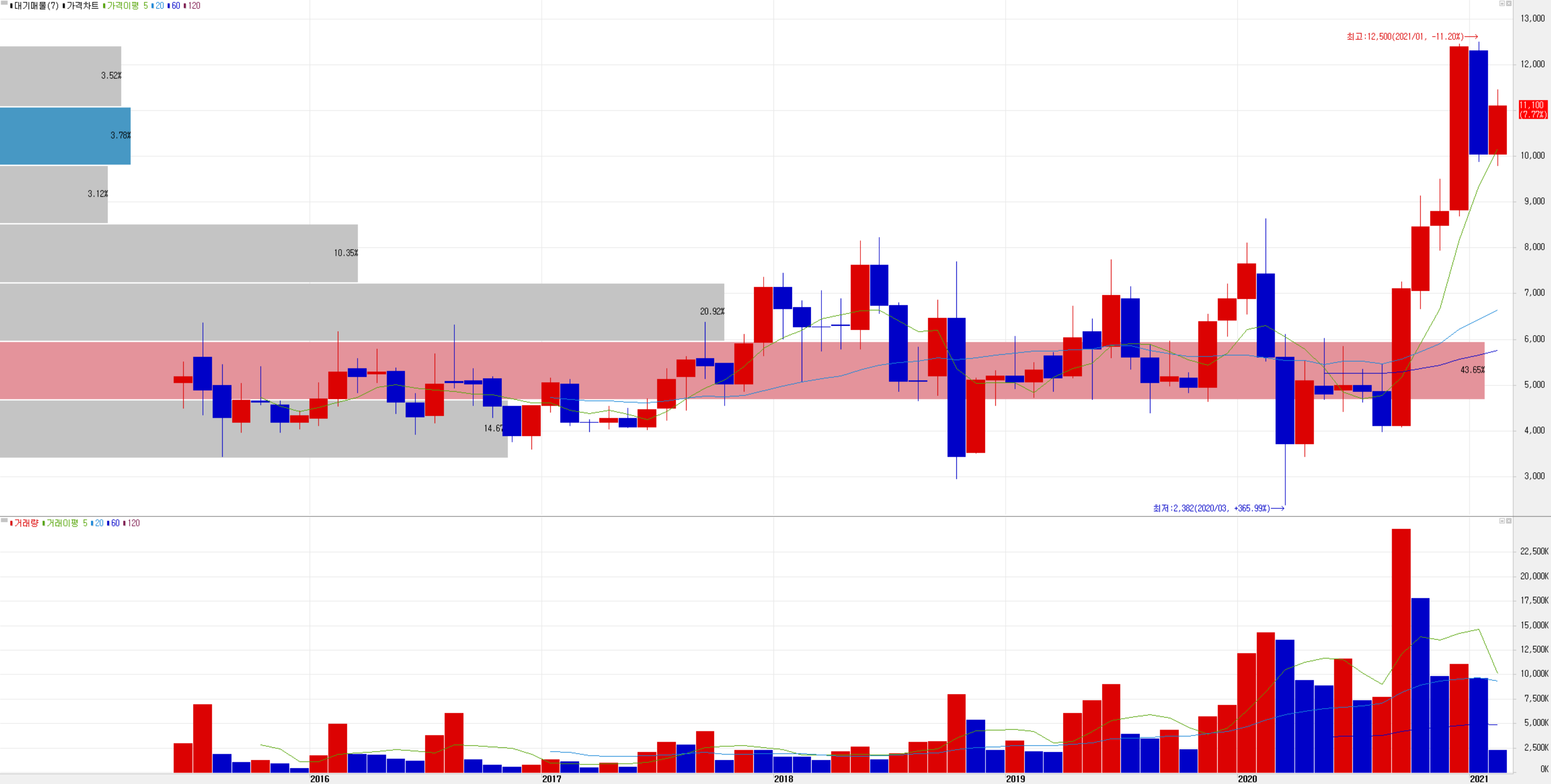 지난 11월 반도체 대장 주의 상승과 함께 당사 포함 전반적인 테마 상승이 이어지다가 1월 초부터 조정을 받는 모습입니다. 수급에서는 금융투자의 꾸준한 매수세와 개인의 매수 우위가 이어지다가 실적 발표 당일 에는 개인의 차익실현 매물이 나왔습니다. 2월 9일 실적 발표에 따라 주가가 급등했으나, 기술적으로 추세를 판단하기에는 이른 감이 있습니다. 다만 4분기 호실적의 주요 요인들이 2021년에도 지속될 확률이 높기 때문에 실적 모멘텀에 따른 추세 전환이 나타날 수 있겠습니다. 아래 월봉 상으로는 거래량이 뒷받침되지 않아 아쉬움이 있지만 기술적으로 좋은 흐름을 보이고 있습니다. 개인적으로는 추가 조정 시 진입할 계획이며, 18,000원을 적정 주가로 보고 있습니다.