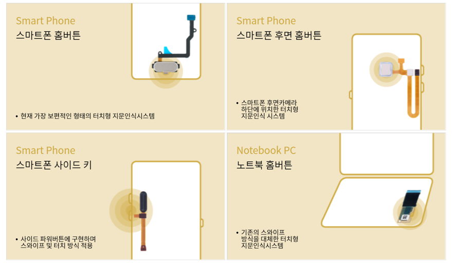 당사는2011년부터 쌓아온 지문인식 기술력을 기반으로 업계 글로벌 기업들과 공동으로 선행연구를 진행하고 있습니다. 스마트폰, 노트북 등의 지문 인식 기반 홈버튼 등 고객의 다양한 요구 사양에 대한 솔루션을 제공하고 있습니다.