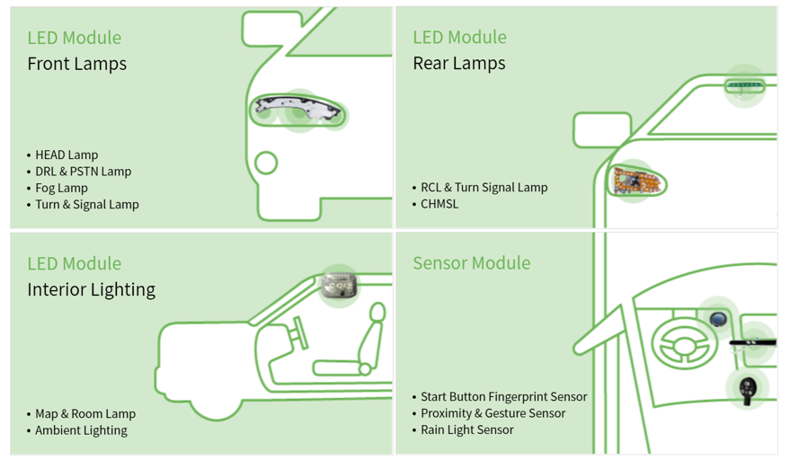 당사의 자동차용 LED 사업은 지난 2011년 시작되어 고객사에 공급을 개시한 이래로 지금까지 그 기술력을 인정받아 꾸준한 매출을 유지하고 있는 분야입니다. 또한 LED 뿐만 아니라 다양한 센서 모듈도 공급하고 있습니다.