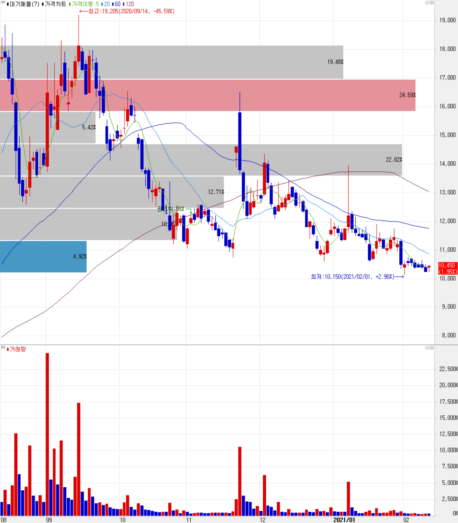 당사의 주가는 2월 실적 발표 이후부터 중기 하락 추세를 보이는 모습입니다. 2월 10일 장 종료 기준 10,450원에 거래를 마쳤습니다. 외국인 비중은 22.33%로, 시가총액 6,888 억 원으로 코스피 상위 268위 종목입니다.