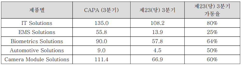주요 제품 별 생산 실적 및 가동률