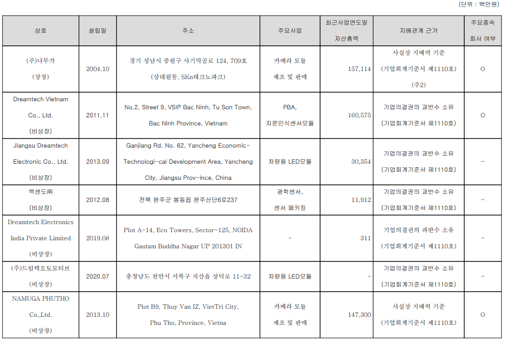 당사는 7개의 종속회사를 보유하고 있으며,최근에는 광학 센서, 전문으로 하는 종속회사의 엑센도의 사업을 양수하여 당사 내 광학 센서 연구 개발에 자원을 투입하여 경쟁력을 강화할 예정이고, 카메라 모듈을 전문으로 제조하는 나무가를 인수하면서 카메라 ToF(Time of Flight, 비행시간거리 측정) 사업에도 진출하였습니다.