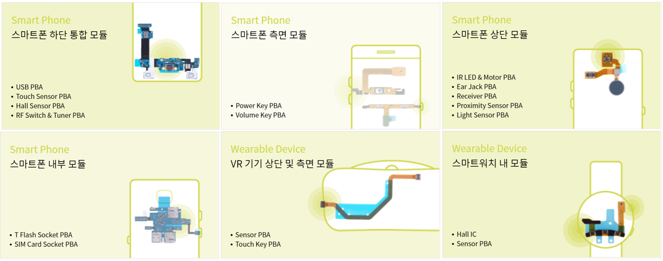 최근에는 스마트폰을 넘어 스마트 워치 내부 PBA 모듈, Hall IC 와 VR 기기 등의 모듈까지 활용 분야를 확대하고 있습니다.