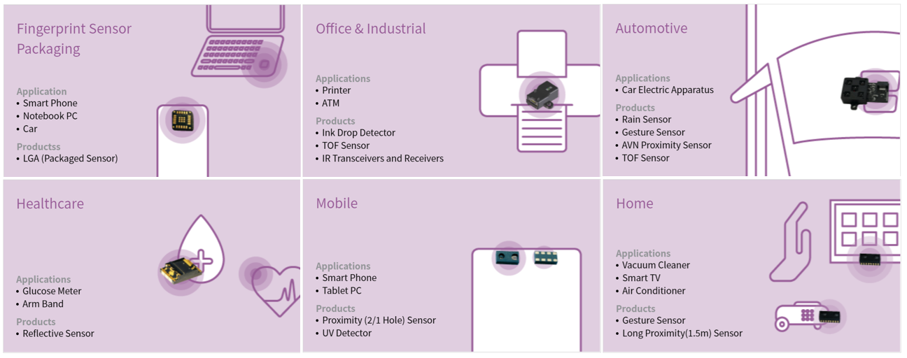 당사의 센서는 지문인식 기반의 센서, 의료 분야, 홈오토메이션, OA 기기 및 자동차 분야 등 다양한 산업 분야에 적용할 수 있으며 자사가 보유한 반도체 패키징 시설과 숙련된 공정 기술로 가격 경쟁력을 갖춘 고품질의 센서를 제공합니다.