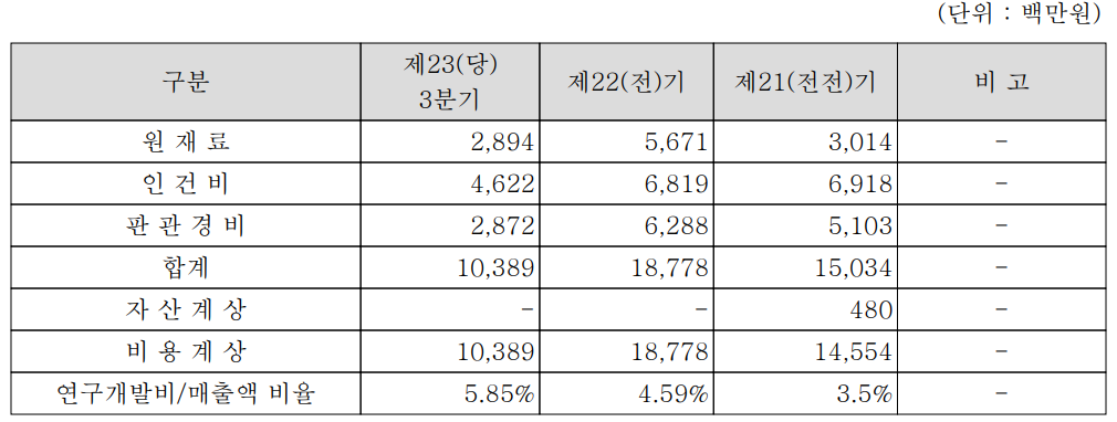 당사의 지난 2020년 3분기까지 연구개발 비용은 전체 매출의 5.85%를 차지하고 있으며, 최근 3개년 간 증가 추세에 있습니다.