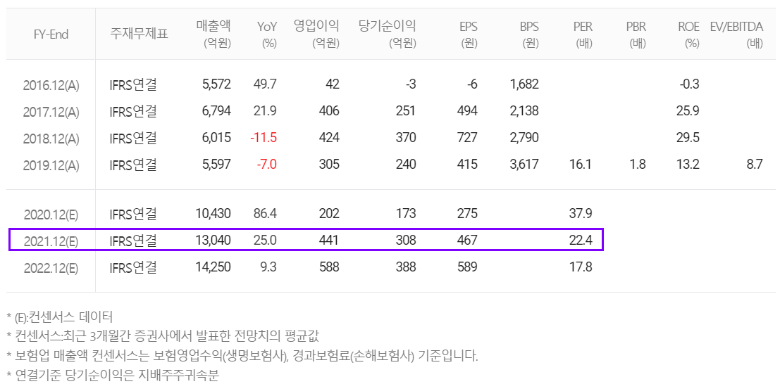 당사의 컨센서스 기준 2020년 매출액은 1조 430억 원을 예상했으나 지난 9일 잠정 발표에 따르면 연매출 1조 458억 원으로 소폭 상회하는 결과를 만들었습니다. 영업 이익은 202억을 추정했으나 196억 원을 기록하면서 추정치보다 낮은 수치를 기록했습니다.