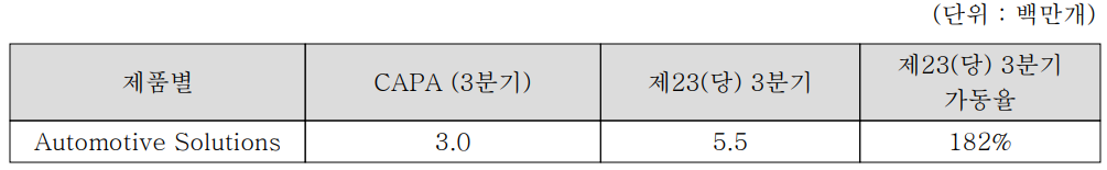 당사는 지난 2020년 7월 1일 부로 AES 사업부문을 물적분할((주)드림텍오토모비트)하여 일부 설비 등을 강소 법인으로 이전하였습니다. 가동률은 본사 기준의 AES 사업부의 CAPA 및 생산실적이 설비 변동을 포함하여 3분기 누적으로 집계되어 높게 나왔습니다.