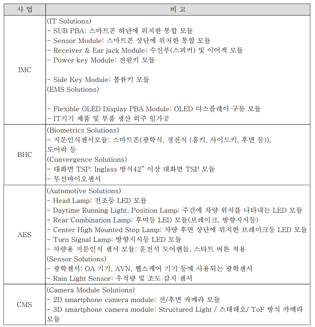 당사는 1988년 설립되어 스마트폰, 스마트워치 등 IT기기에 사용되는 각종 PBA 모듈을 개발 및 공급하는 IMC (IT & Mobile Communications) 사업과사업과 생체 인식 모듈과 전통적인 제품에 IT기술을 접목한 컨버전스 제품 및 부품을 개발 공급하는 BHC(Biometrics, Healthcare & Convergence) 사업, 그리고 자동차 전장 부품과 광학 센서 등을 개발 및 공급하는 AES(Automotive Electronics & Sensors) 사업, 스마트폰에 채택되는 카메라모듈을 공급하는 CMS(Camera Module Solutions) 사업 등으로 구분되어 사업을 수행하고 있습니다.