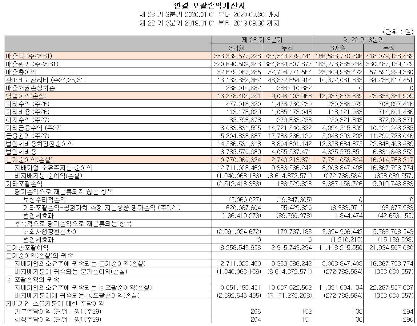 당사의 2020년 3분기 매출액은 7375억 원으로 전년 동기 대비 76% 증가했고, 영업 이익은 163억 원으로 30% 감소했습니다.
