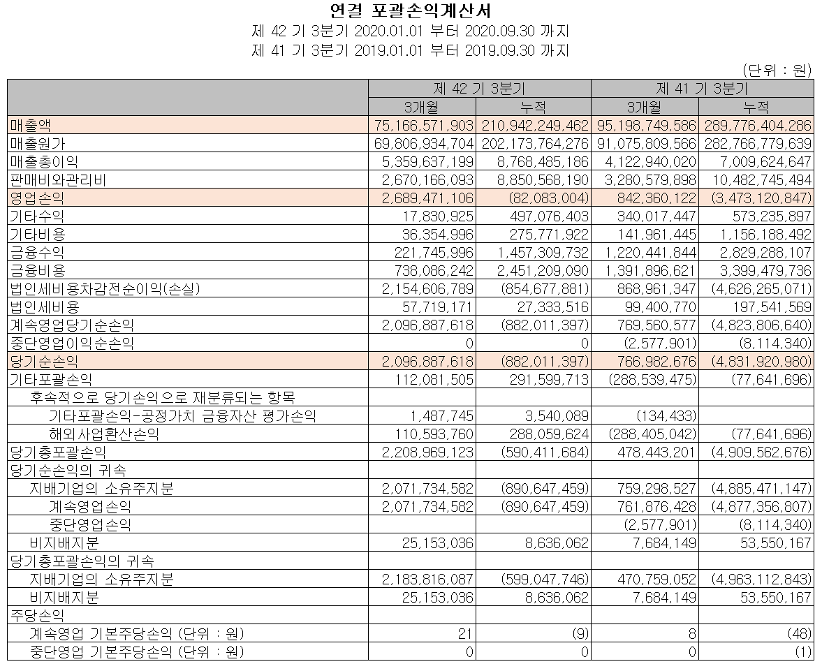 당사의 2020년 3분기 누적 기준 매출액은 2109억 원으로 전년 동기 대비 27.2% 감소했고, 영업손실은 97.6% 감소했습니다. 코로나19의 영향과 전방산업인 완성차 산업의 침체로 인해 매출이 부진하였으나 자체 고정비 및 원가 절감 노력으로 점차 영업 손실 폭이 축소되고 있는 점이 인상적입니다.