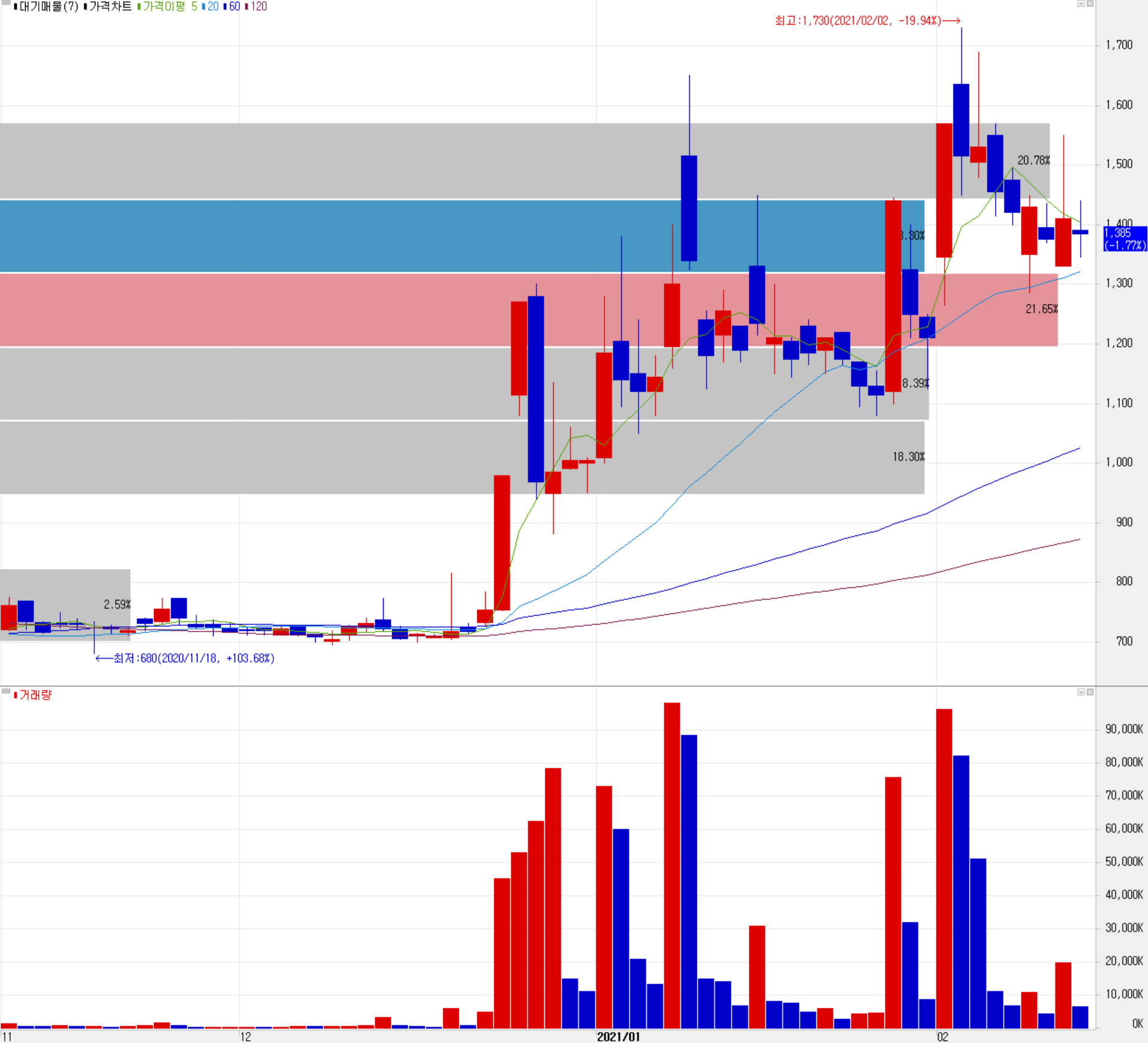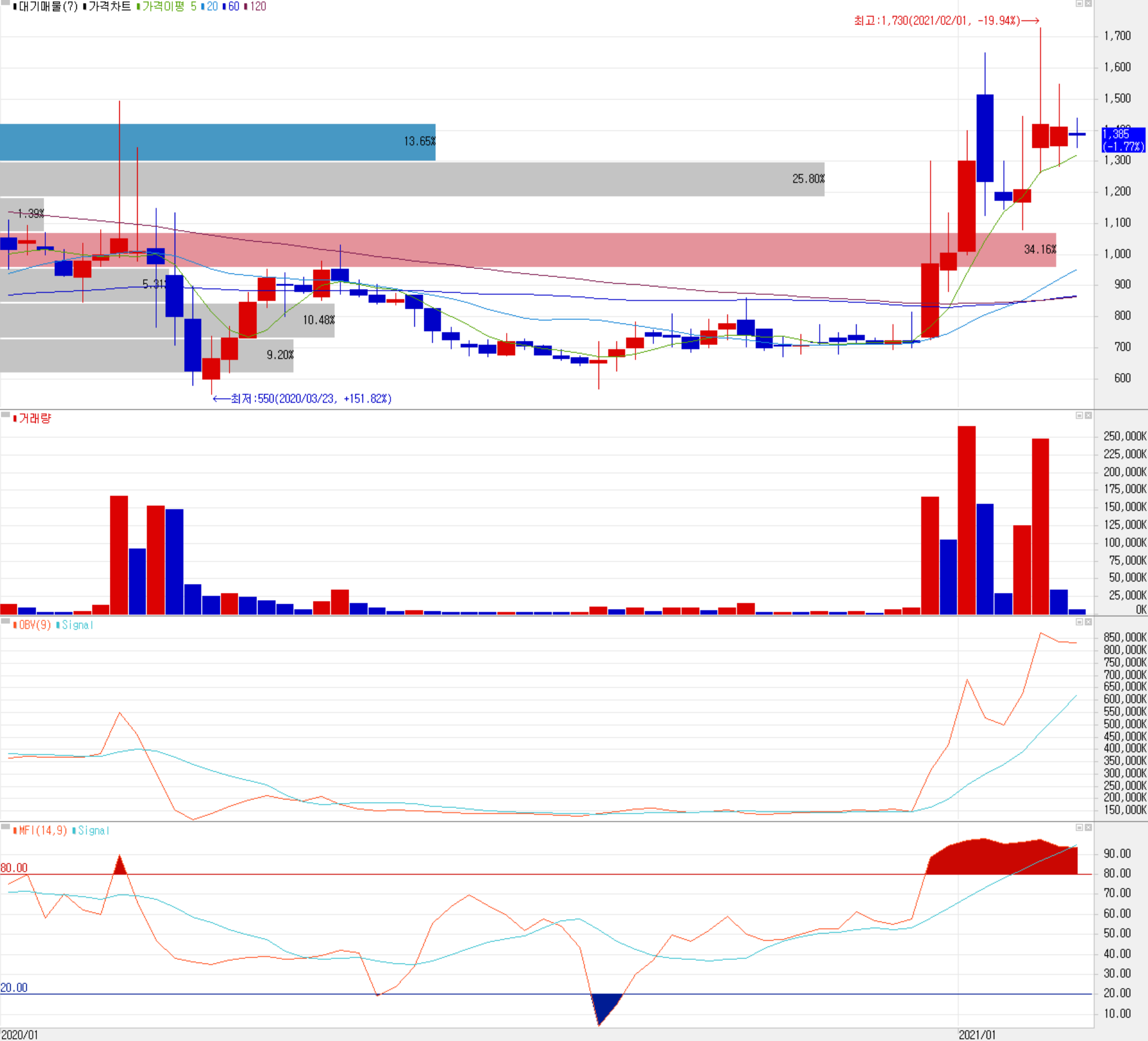 제가 주봉이나 월봉 차트를 볼 때 참조하는 OBV, MFI 지표입니다. 현재 MFI 지표상 90이 넘어 과매수 상태를 보여주고 있습니다. 회사 매각설이 가시화된 상태까지 감안한다면 중장기 관점을 갖기에는 아직 이른 종목으로 판단됩니다.