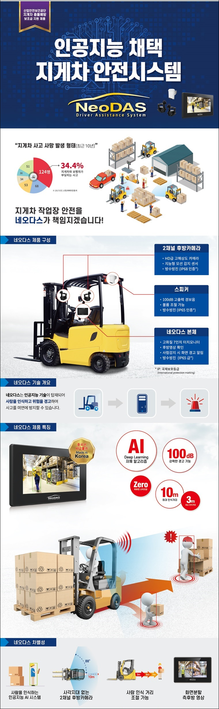 NeoDAS Q4 제품은 기존의 ADAS 시스템에 AI 시스템을 접목하여 물류 및 생산 시설 등에서 많이 사용되는 지게차에 적용하여 주변 사물 뿐아니라 사람도 인식하는 기능이 추가되면서 산업 현장에서 예기치 못한 사고를 방지할 수 있도록 해줍니다.