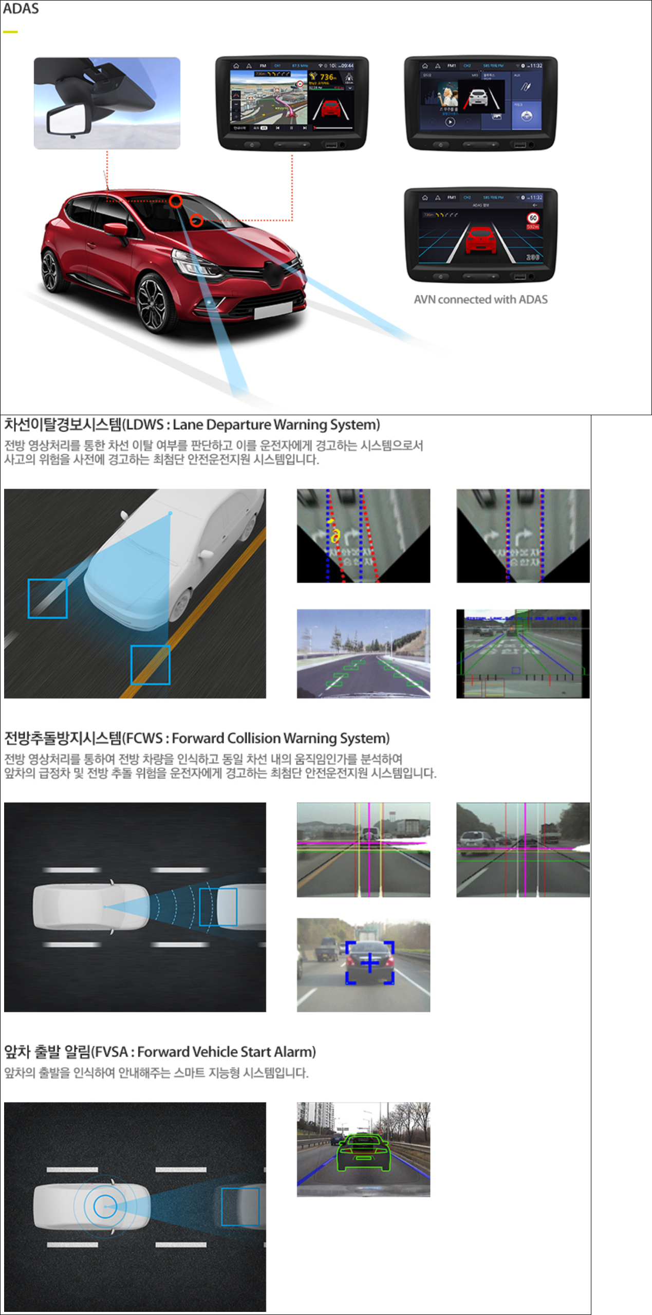 당사는 차선 이탈 보조 시스템(LDWS, Lane Departure Warning System), 전방 추돌 방지 시스템(FCWS: Forward Collision Warning System), 앞차 출발 알림(FVSA: Forward Vehicle Start Alarm) 등의 연구개발을 통해 첨단 운전자 보조 시스템(ADAS)을 개발하여 2018년 르노삼성자동차와 공급 계약을 체결하였으며, SCANIA 지정 ADAS 공급 계약을 연이어 체결하면서 자율 주행 기반의 시스템을 위한 기술력을 인정받고 있습니다.