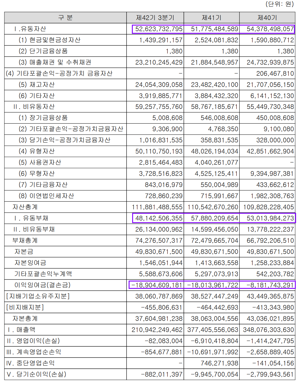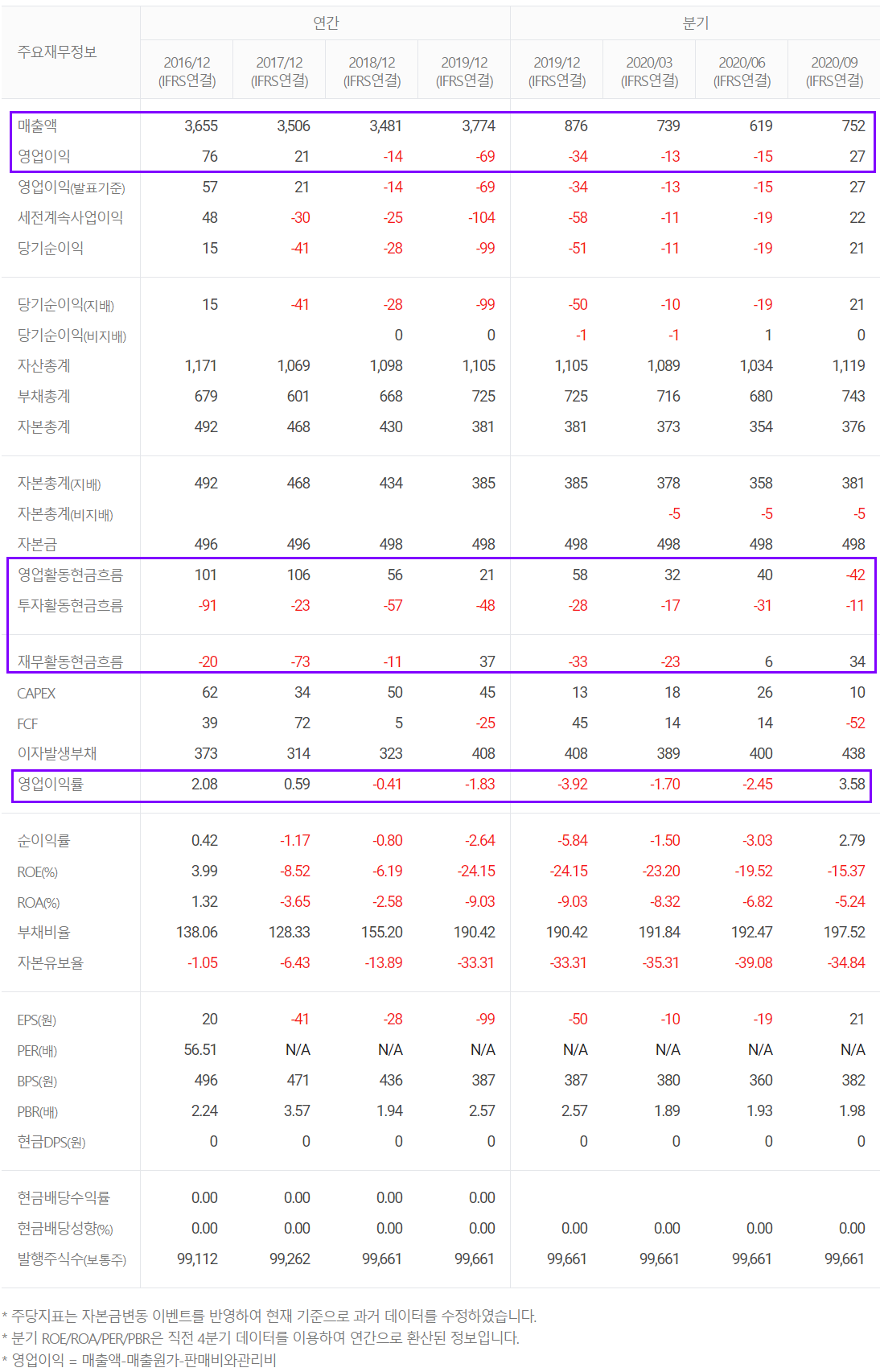 2020년 3분기 말 기준 당사의 현금성 자산은 144억 원, 유동 부채 중 단기 차입금은 220억 원입니다. 지난 2018, 2019년 계속되는 당기순손실 규모가 대폭 개선되고 있습니다. 무엇보다 당사는 원가 절감이나 고정비 절감 또는 다른 전략적 방법을 통해서라도 이익률이 개선이 당면 과제인 것 같습니다.