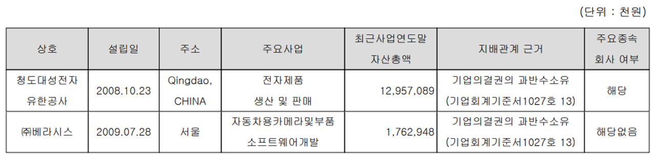 당사는 중국 청도에 '청도 대성전자 유한공사', 국내 (주)베라시스를 종속회사로 두고 있으며 당사와 동종업종에 대한 업무를 목적으로 하고 있습니다.