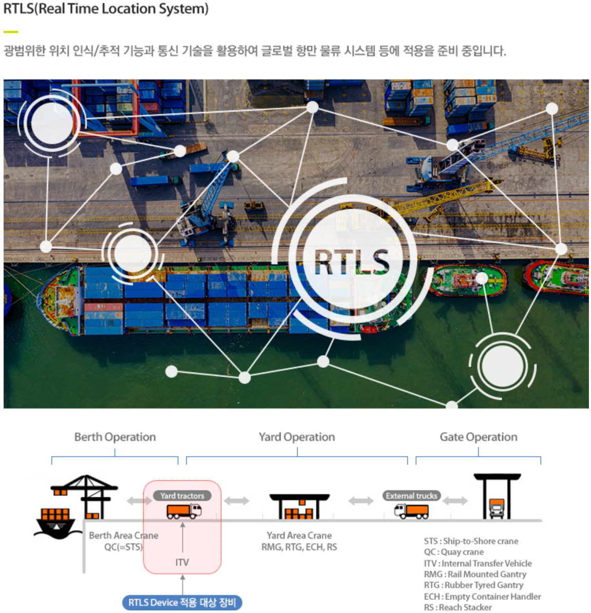 항만이나 공항 물류 등 대규모 야드내에서 트랙터 내에 당사의 광범위 실시간 인식/추적 시스템인 RTLS 시스템을 채택하여 항만의 선박 정박지부터 야적장까지 운송하는 항만 물류 시스템에 적용을 추진하고 있습니다.