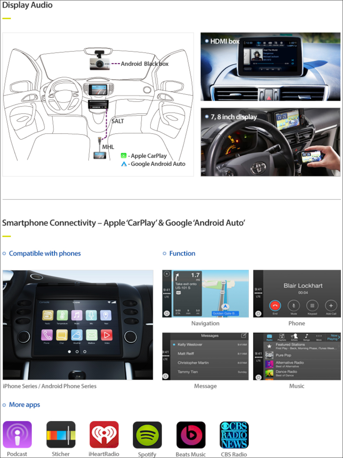 당사의 디스플레이 오디오는 Apple Carplay, Google Android Auto 기반의 오디오 환경을 제공하며, 기타 팟캐스트를 비롯한 다양한 스마트폰 앱과 결합한 디스플레이 오디오 시스템을 제공합니다.