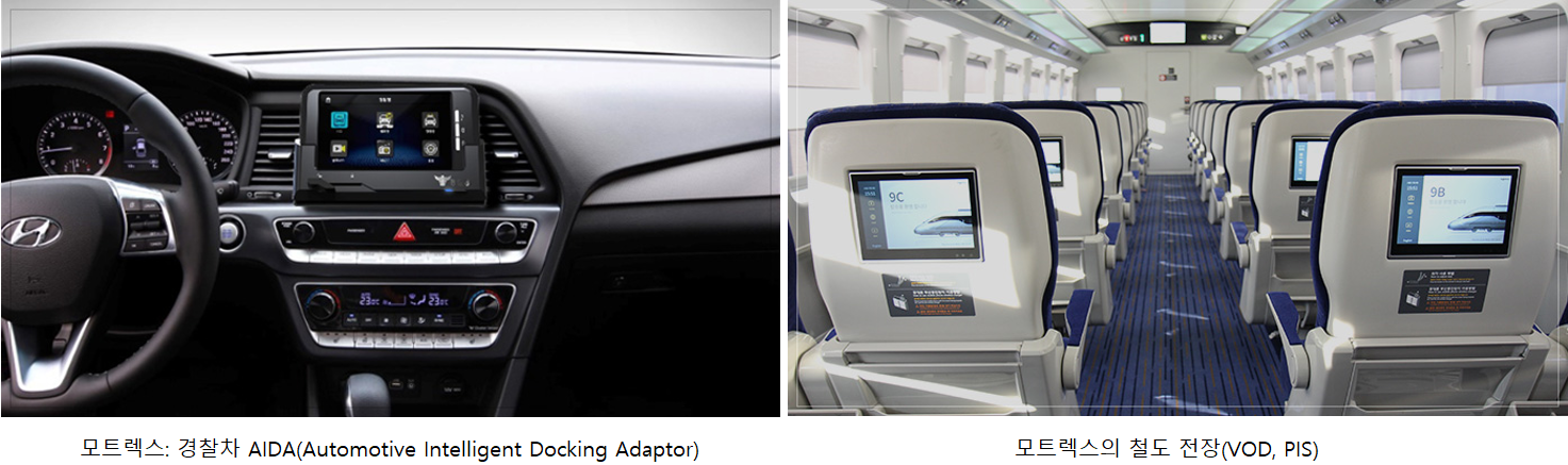 스마트 디바이스(태블릿 등)를 경찰차 같은 특수 목적의 차량과 유/무선으로 연결하여 차량의 다양한 기능을 제어할 뿐만 아니라, 실시간 교통정보, 내비게이션, 온라인 서비스 등을 모니터링할 수 있는 도킹 어댑터를 제공합니다. 또한 철도 차량의 경우 열차 승객에게 개인별 디스플레이를 통한 인터넷, 유튜브 등의 엔터테인먼트 서비스와 차내 방송, 이동 경로 정보 등을 제공합니다.