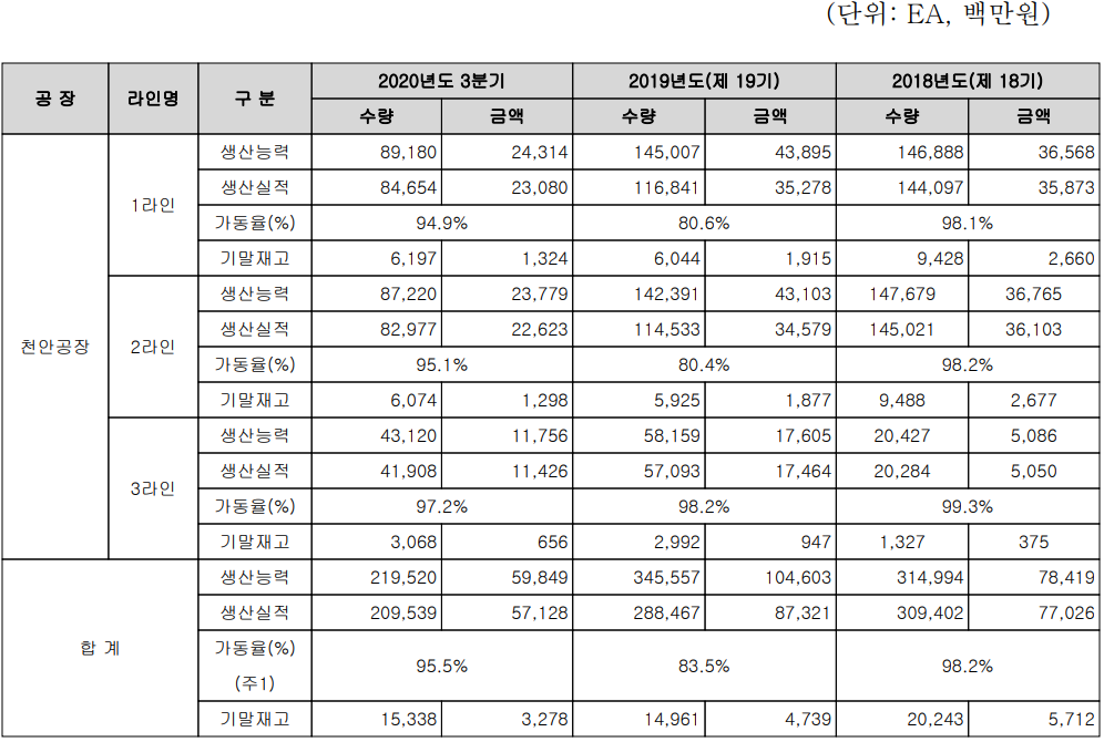 모트렉스 최근 3년간 생산 실적 및 가동률