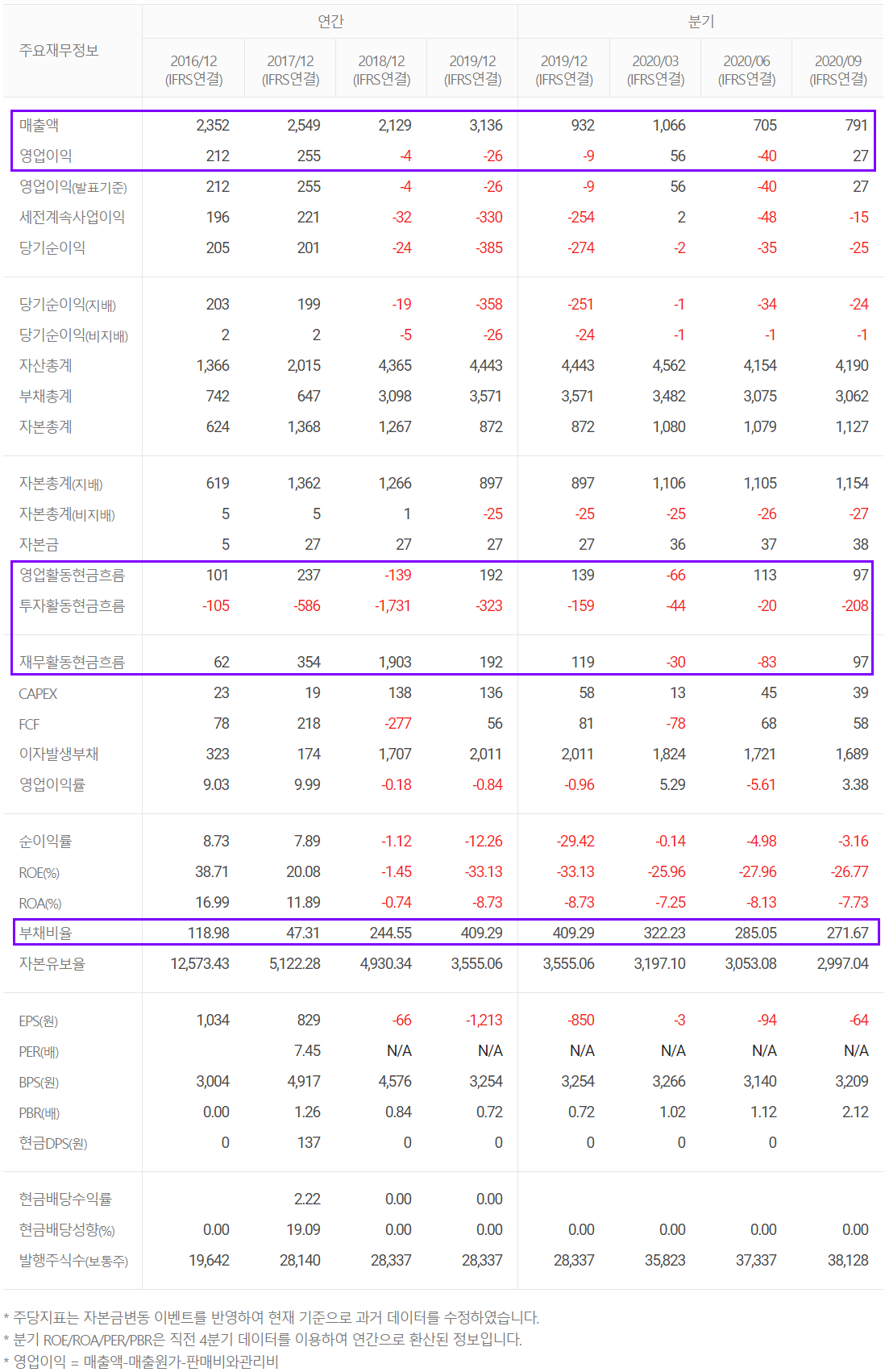 당사의 2020년 3분기 누적 기준 매출액은 2562억 원으로 전년 동기 대비 16.2% 증가했고, 영업이익은 44억 원을 기록하면서 흑자 전환했습니다. 당기 순손실은 전년 대비 44% 감소했습니다.