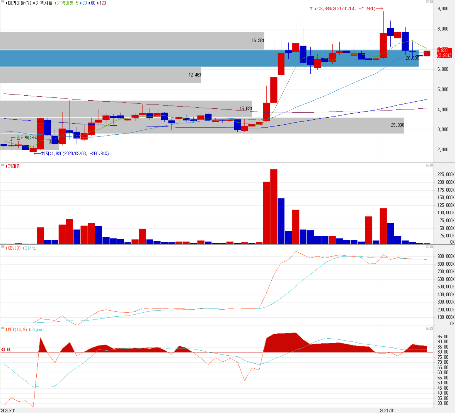 오늘은 기관과 개인의 매수로 주가가 소폭 반등했으나 전반적으로 최근의 수급에서는 개인은 매수 우위, 외국인과 기관은 매도 우위를 보이고 있습니다. 기타 최근 주가의 변동성은 대부분 자율 주행이나 애플 카 등 테마성 상승으로 보이기 때문에 최근 들어 상승분을 대부분 되돌리는 모습이며, 따라서 당사의 주가는 4분기 실적과 함께 지속적인 영업이익에 대한 지속 가능성을 보고 판단하는 게 좋을 듯합니다. 기술적으로는 6,300원을 지지로 보고, 위로는 8,200원 근처를 저항으로 보고 있습니다.