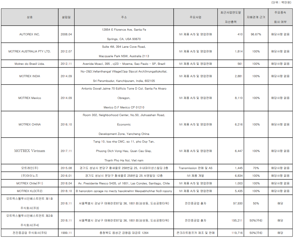 당사는 2020년 3분기 말 현재 14개의 종속회사를 보유하고 있으며, 미국, 호주, 브라질, 인디아, 멕시코, 중국, 베트남, 칠레 등의 해외 법인과 IVI 시스템의 개발을 목적으로 하는 아이노즈 및 펌프카 사업의 시너지를 위해 2018년, 콘크리트 펌프카 국내 1위 기업인 전진중공업을 인수하였습니다.