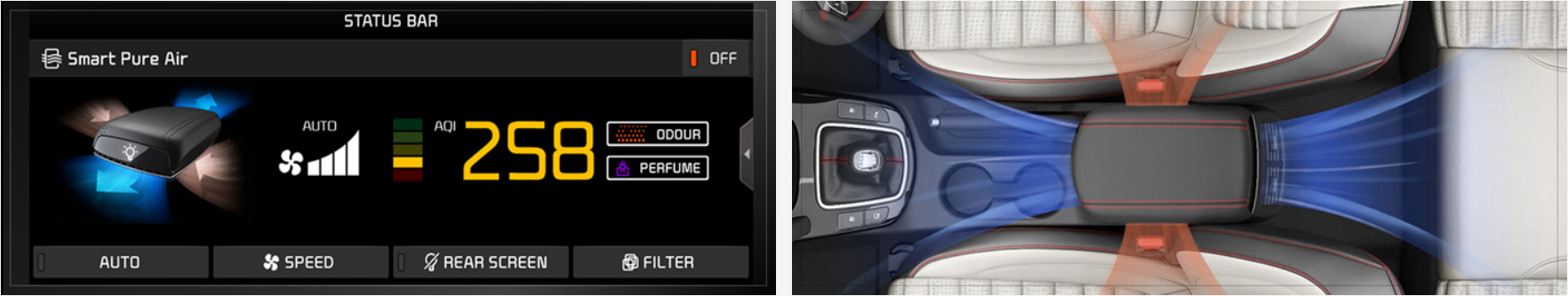 당사의 공기청정기는 세계 최초로 암레스트 타입을 적용하여 차량과 일체화된 디자인에 멀티미디어와 연결을 통해 조작 및 상태 확인이 가능하며, 컵홀더형 공기청정기는 어느 차량에나 설치가 가능합니다.
