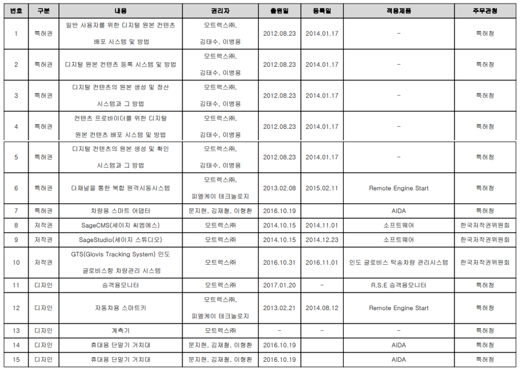 당사의 사업과 연관된 7건의 특허와 3건의 저작원 및 5건의 디자인 등록을 보유하고 있습니다.